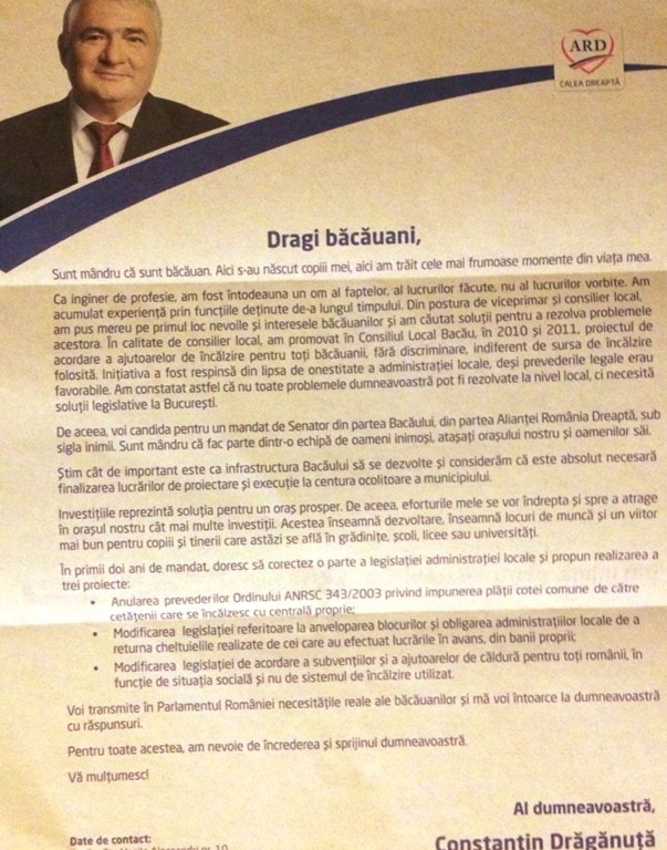 Gata, a început campania electorală. Deocamdată, cu scrisori către alegători. Primul care a luat startul este Constantin Drăgănuță, candidat PDL (ARD, mai nou) pentru un loc în Senat. Promisiunile lui sunt anularea coplății în condominii, pentru posesorii de centrale