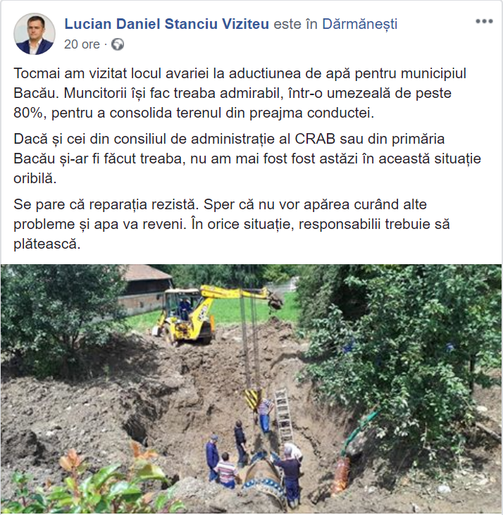 Ce ne propune domnul deputat? „Mai mult, USR vă asistă cu chemarea în judecată a CRAB. Dacă aveți contract cu CRAB, vă simțiți păgubiți de avariile de apă si vreți să dati in judecată CRAB vă invităm să ne contactați la telefon 0751 995 044 sau la sediul nostru din str. George Bacovia nr 10. Profesionisti nu politruci! Daca doriti un Bacau locuibil va invitam sa va alaturati!”