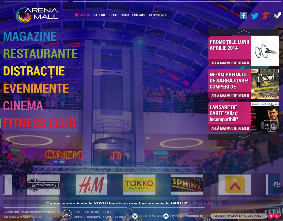 Site-ul Arena Mall din Bacău are un design nou, ultra-viu colorat, îți ia ochii – chestie de gust – are multe poze și scris mare.