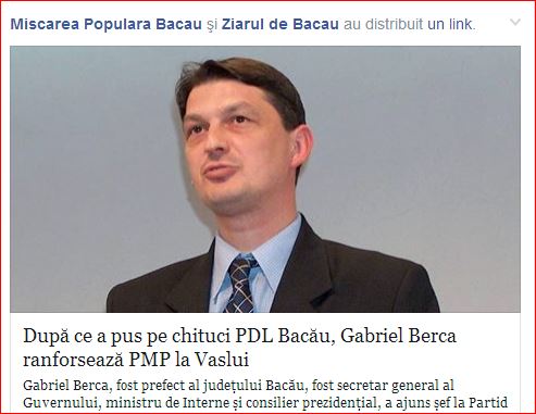 Gabriel Berca, fost politician prin Bacău (ApR, PUR, PNL, PDL), a ajuns președinte la județeana PMP Vaslui. N-a avut loc de Valerian Vreme în organizația din Bacău, unde probabil a lăsat o impresie de neșters, din moment ce „popularii” au dat share pe Facebook unui articol în care Berca e făcut varză.