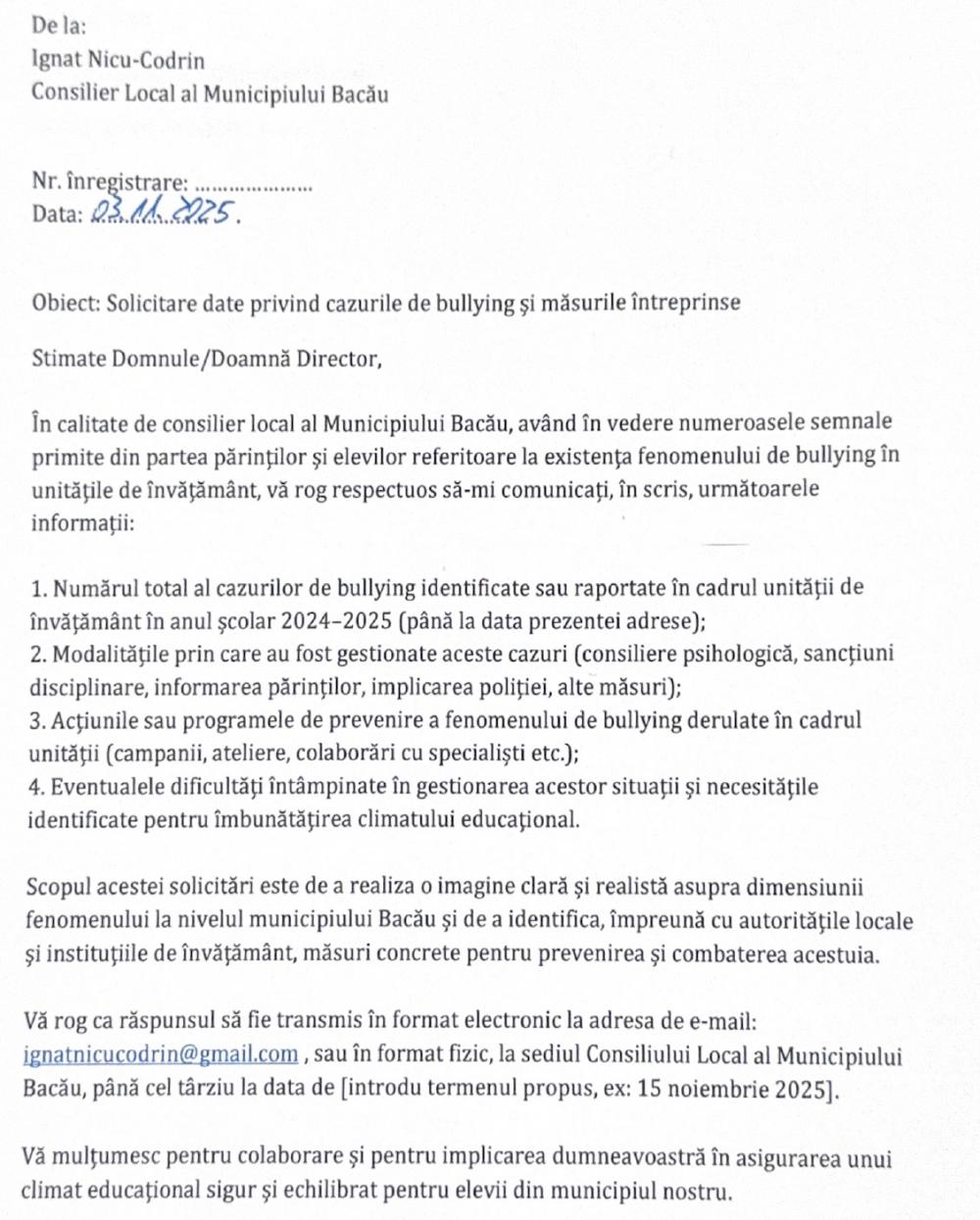 1. Dumneavoastră nu vă adresați „Către domnul/ doamna director (în paranteză, ”Unitatea de învățământ”)….Dumneavoastră vă adresați „Către toate unitățile de învățământ preuniversitar din municipiul Bacău…”