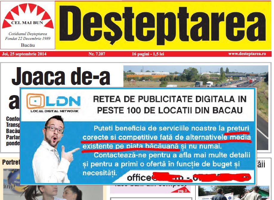 Deșteptarea face un gest curajos și acceptă banii pentru o reclamă care sună ca și cum și-ar da cu barda-n…: „Publicitate (la) prețuri corecte și competitive față de alternativele media existente pe piața băcăuană”.