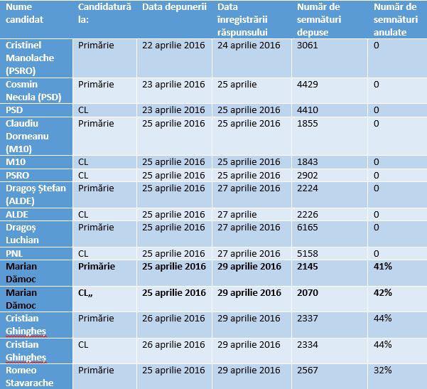 Cred că o parte au fost respinși pe bune, pentru că s-au dus ca nesimțiții cu liste făcute de organizațiile de tineret, pe colțurile meselor, dar statistica ridică mari semne de întrebare în cazul celor doi candidați independenți respinși. Cristian Ghingheș ar avea 44% din semnături anulate, iar Marian Dămoc, 41-42%. Asta pute, pentru că în dreptul altor partide sau formațiuni nu apare nicio semnătură invalidată. Zero! Statistic, ar fi trebuit să fie măcar de sămânță, un 1% acolo, dar nu. Ceea ce arată doar că listele au fost verificate cu dublă măsură, nu că ar fi trebuit respinse și alte candidaturi.