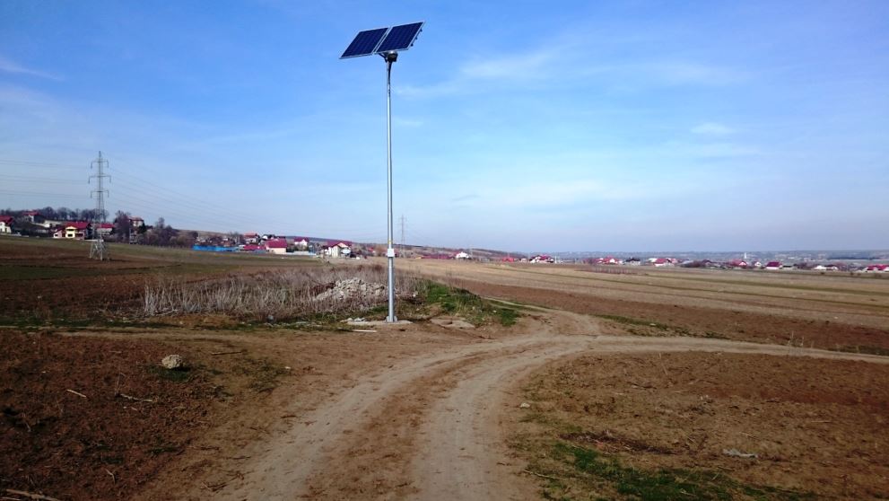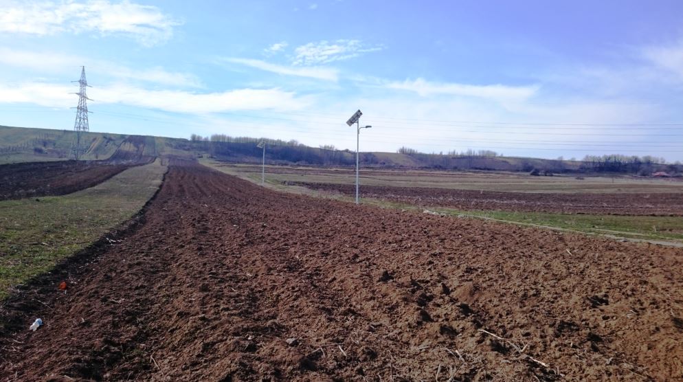 Comuna Mărgineni, județul Bacău, spre Fântânele (sau cum i-o zice). Primăria a luat bani europeni, ca să bage iluminat public ecologic în toată comuna. Pentru că erau bani de cheltuit, s-au montat stâlpi și pe-acolo pe unde nici cu gândul nu gândești că era nevoie. De-a lungul unei arături, de par egzamplu.